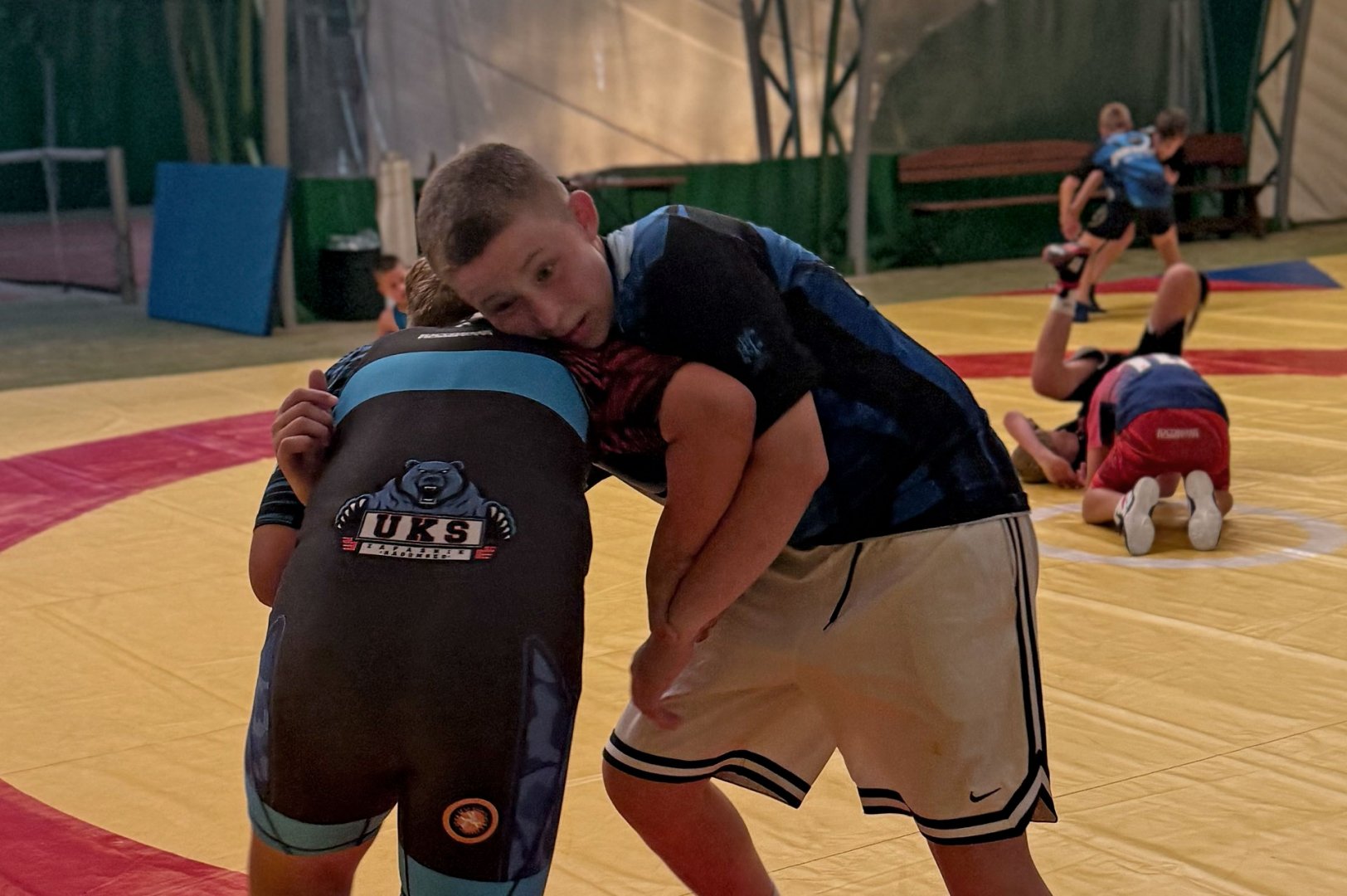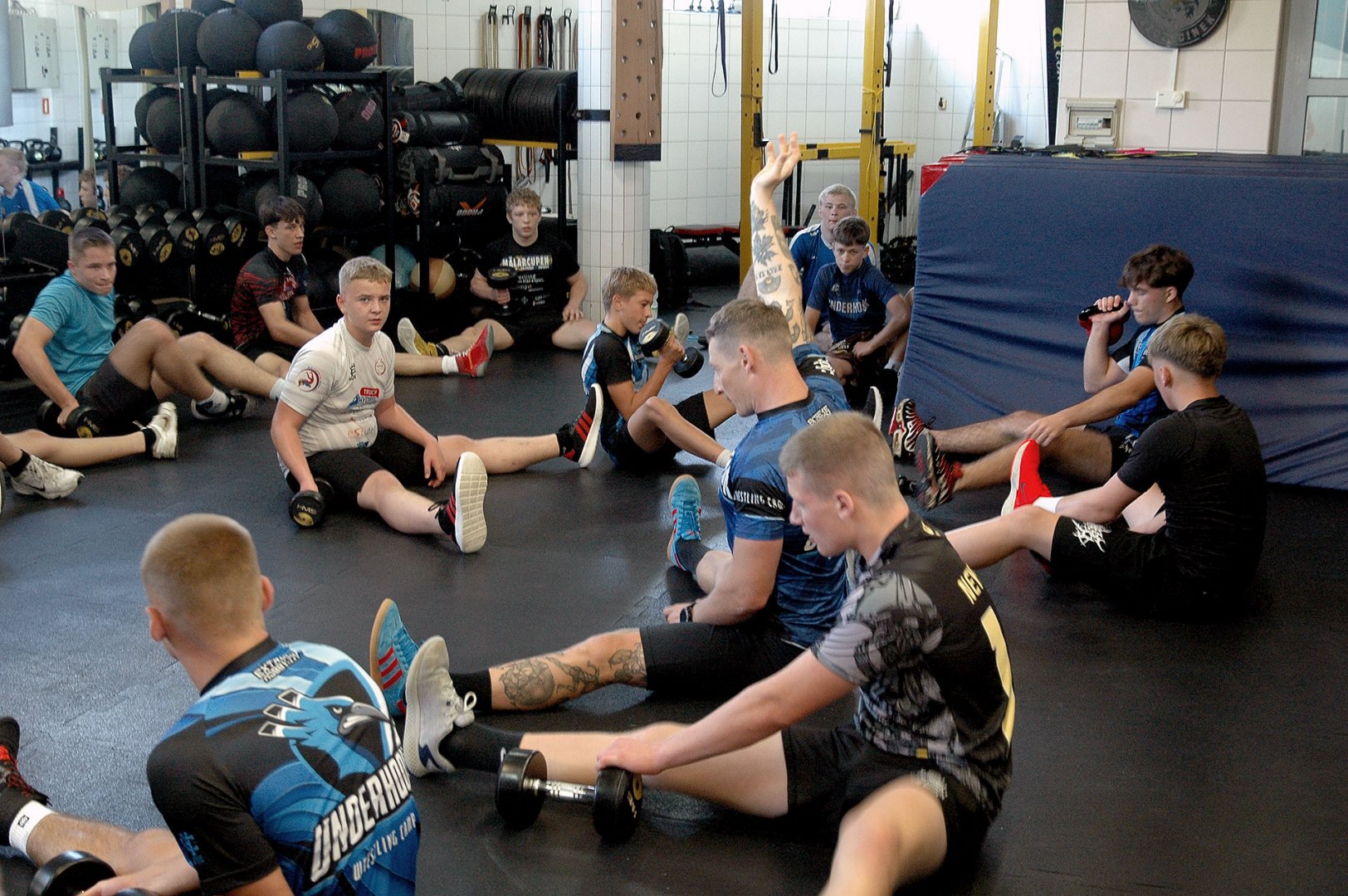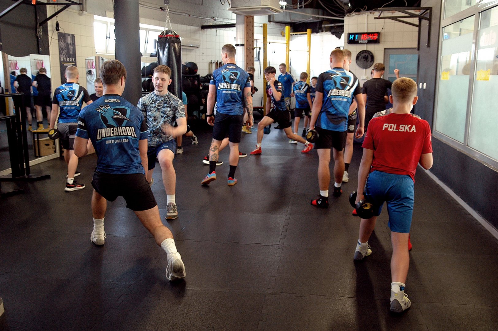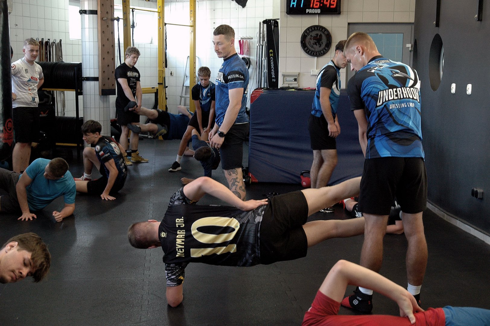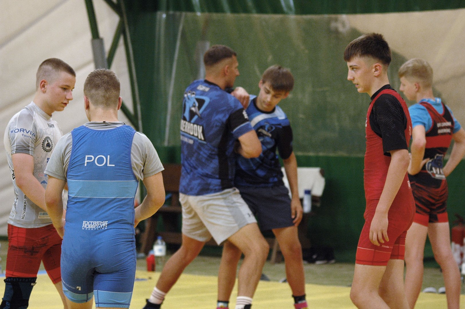 Grupa starszych zawodników pod wodzą trenerów Radosława Grzybickiego, Macieja Korochody i Mariusza Torbiczuka. rozpoczęła dzień zajęciami na macie o godzinie 11:00.